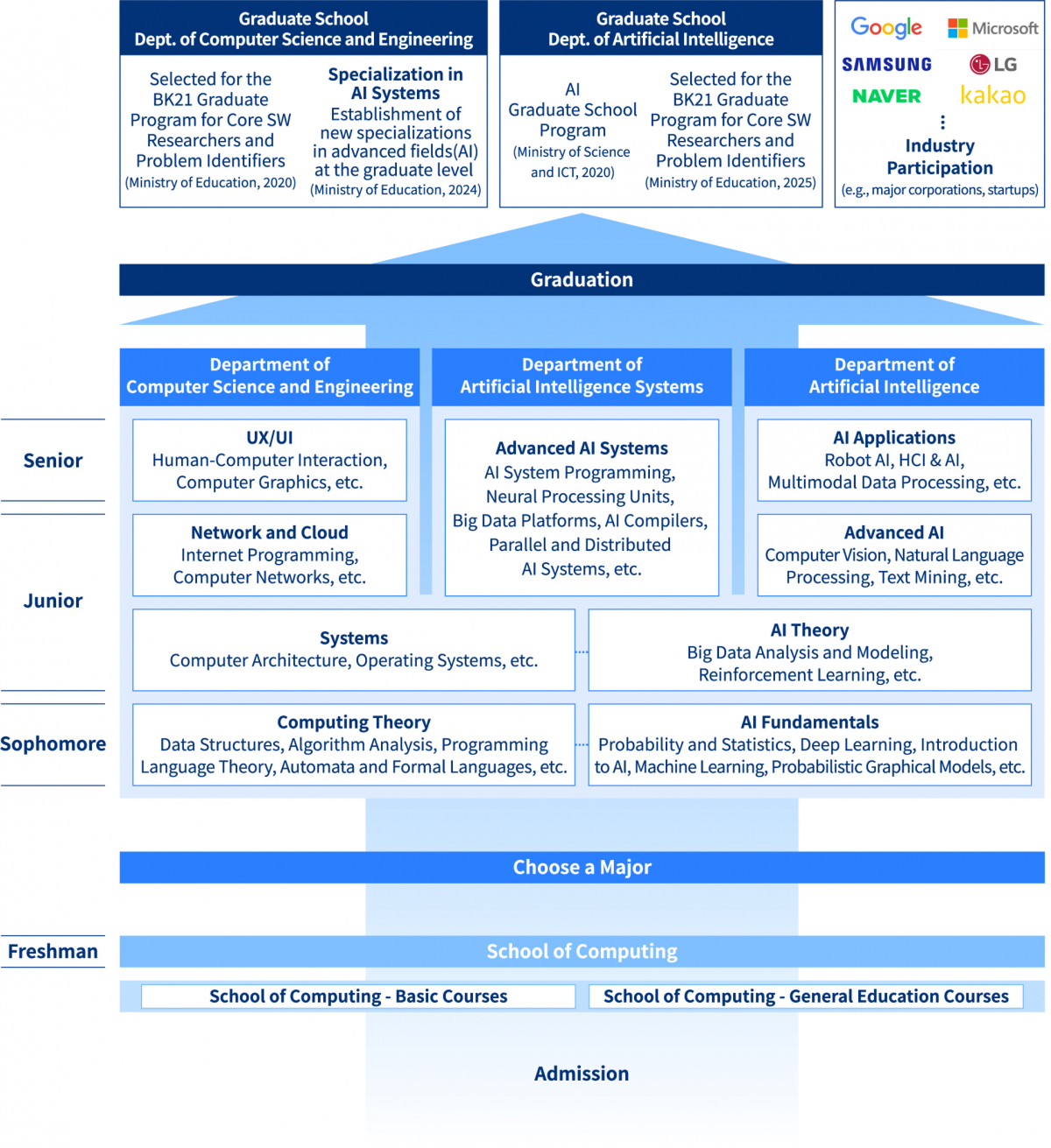 To support this vision, the College of Computing has established the School of Computing, integrating the existing Department of Computer Science and Engineering, Department of Artificial Intelligence, and the newly created Department of Artificial Intelligence Systems. Beginning in 2025, incoming students will be admitted to the School as a single cohort and will select one of the three majors upon entering their second year. This structure allows students to explore their interests before choosing a field of study, enabling them to develop into professionals who are both highly specialized and adaptable in the rapidly evolving fields of computing and artificial intelligence.