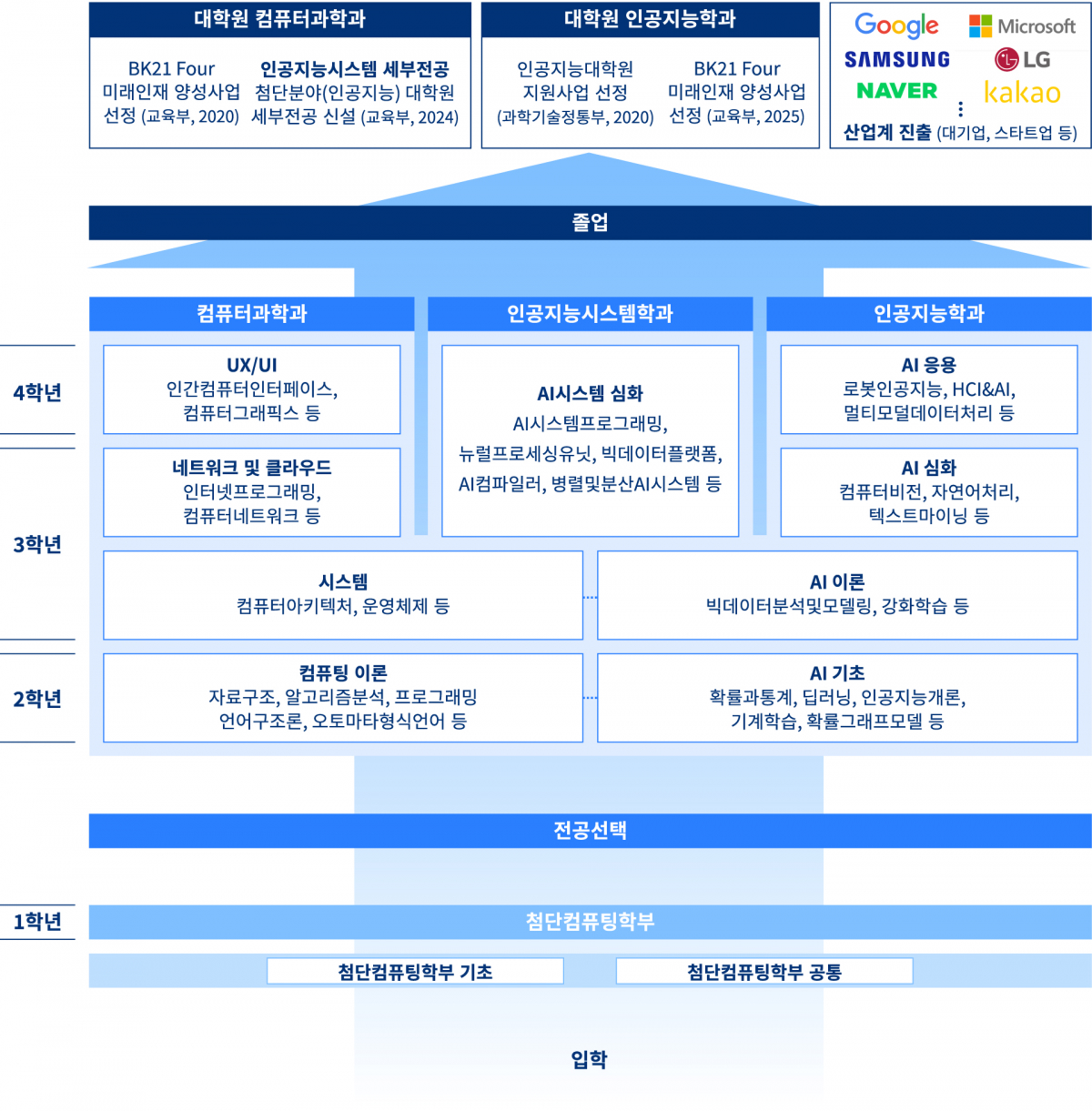 컴퓨터과학과는 기초 컴퓨팅 이론과 소프트웨어 개발에 강점을 지니고 있으며, 인공지능학과는 AI 알고리즘과 데이터 분석 분야에서 뛰어난 역량을 발휘합니다. 인공지능시스템학과는 이러한 이론적 기반을 실제 시스템으로 구현하는 능력을 키우는 데 중점을 둡니다. 이 세 학과의 통합으로 구성된 첨단컴퓨팅학부는 각 학과의 교육 프로그램을 공유하여, 학생들이 기초 이론부터 구현 및 응용까지 다양한 과정을 통합적으로 학습할 수 있는 커리큘럼을 제공합니다.
